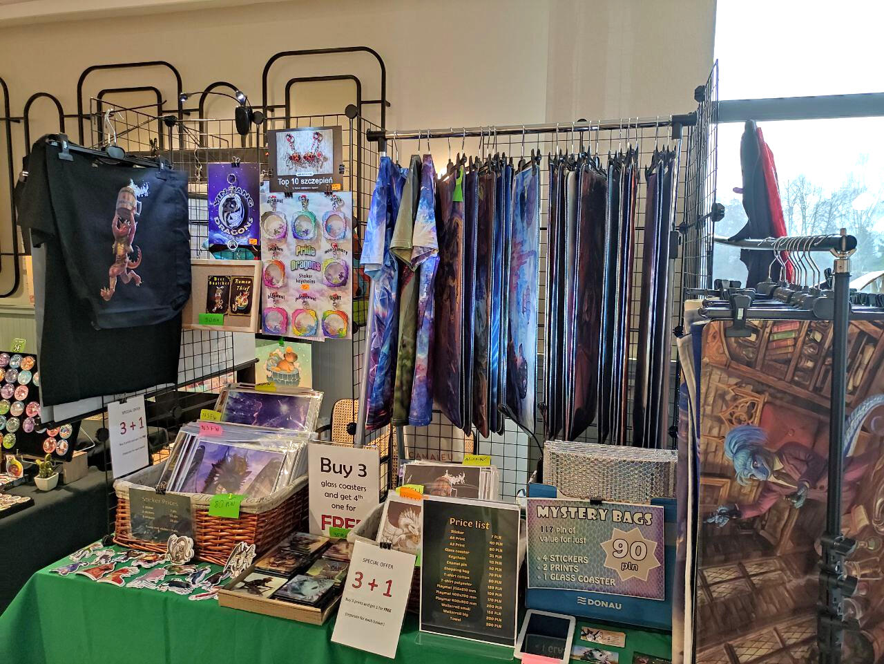 I sell mostly home decor type of merch, for example gaming playmats, glass coasters, tote bags, towels, blankets, art prints, wallscrolls. Recently I am expanding my offer to stickers, keychains, enamel pins and more!